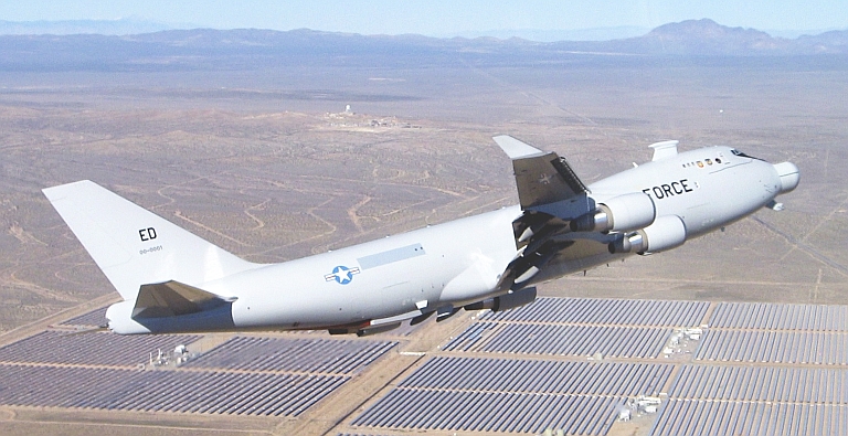 美國空軍第一架機(jī)載激光武器以波音747-400F為平臺,隸屬于美國空軍愛德華茲空軍基地,編號00-0001。由導(dǎo)彈防御局(MDA)、美國空軍 與波音公司、洛克希德·馬丁公司、諾斯羅普·格魯曼公司合作研制。該飛機(jī)裝載了功率強(qiáng)大的高能COlL化學(xué)激光器,用于摧毀處于助推段的彈道導(dǎo)彈。