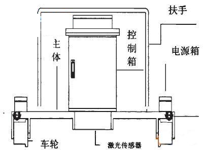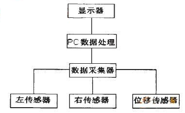 與定子高度測量一樣,該系統(tǒng)也是采用三角法激光測距,監(jiān)測儀由2個激光傳感器組成,分別測量感應板的兩邊,通過位移傳感器等間距采樣并計算當前的里程,然 后經計算機處理分析后在顯示屏上顯示實時測量結果,測量小車采樣頻率高,可達到16kHz,測量精度≥0.04min,可進行事件觸發(fā)(即發(fā)現(xiàn)數(shù)據超標才 開始記錄,以節(jié)約內存空間),傳感器的采樣間隔可調,數(shù)據處理可靠,不失真。系統(tǒng)構成圖和主體示意圖分別如圖4和圖5所示。