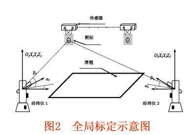 在實(shí)際應(yīng)用 中,通常是將多個(gè)視覺傳感器組成一個(gè)視覺檢測(cè)站,每個(gè)傳感器首先計(jì)算出被測(cè)點(diǎn)在當(dāng)前的傳感器坐標(biāo)系中的坐標(biāo),然后將所有視覺傳感器坐標(biāo)系匯聚在系統(tǒng)坐標(biāo)系 下,從而完成測(cè)量。系統(tǒng)的工作主要建立在攝像機(jī)模型和立體視覺傳感器三維測(cè)量模型的基礎(chǔ)上。為了得到被測(cè)點(diǎn)在車身定位坐標(biāo)系中的坐標(biāo),需要以標(biāo)準(zhǔn)坐標(biāo)系為 中介,把被測(cè)點(diǎn)在傳感器坐標(biāo)系中的坐標(biāo)轉(zhuǎn)換到被測(cè)點(diǎn)在車身定位坐標(biāo)系中,這就需要把傳感器坐標(biāo)系、車身定位坐標(biāo)系與標(biāo)準(zhǔn)坐標(biāo)系統(tǒng)一起來,稱為中介坐標(biāo)統(tǒng)一 法。完成上述工作是通過局部標(biāo)定和全局標(biāo)定的過程來實(shí)現(xiàn)的。局部標(biāo)定是利用透鏡透視原理,標(biāo)定出從世界坐標(biāo)系到傳感器三維坐標(biāo)系的12個(gè)外部參數(shù);全局標(biāo)定采用的是中介坐標(biāo)系方案(圖2),通過采用靶標(biāo),求出測(cè)量傳感器所對(duì)應(yīng)的傳感器坐標(biāo)系到經(jīng)緯儀坐標(biāo)系的轉(zhuǎn)換矩陣,完成坐標(biāo)系的統(tǒng)一。