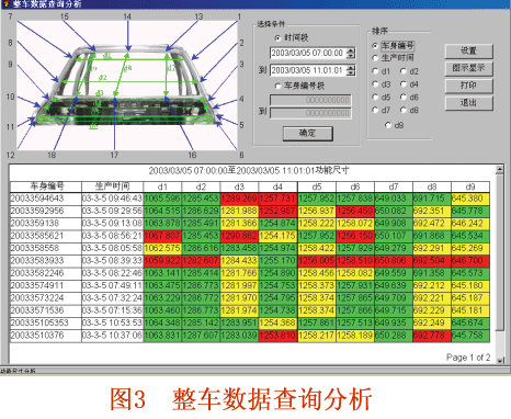 整車數(shù)據(jù)查詢是按整個(gè)車身進(jìn)行查詢,反映整個(gè)車身的情況。整車數(shù)據(jù)查詢既可以按照車身的生產(chǎn)時(shí)間進(jìn)行查詢,也可以按照車身的編號(hào)進(jìn)行查詢。查詢數(shù)據(jù)的列表可以采用多種排序方式:車身編號(hào)和點(diǎn)號(hào)、點(diǎn)號(hào)和車身編號(hào)、生產(chǎn)時(shí)間及生產(chǎn)班次等。數(shù)據(jù)的顯示采用3種不同的底色來反映測(cè)量點(diǎn)加工誤差的大小。