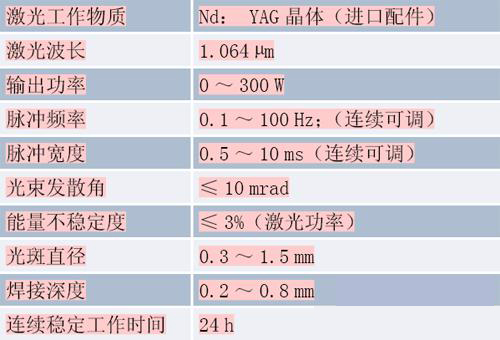 激光器系統(tǒng)主要由激光工作物質(zhì)、泵浦氙燈、聚光腔及諧振腔組成。振鏡式激光焊接機激光工作物質(zhì)為YAG棒。主要參數(shù)如表1所示。