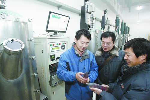 1226日,安徽環(huán)巢光電科技有限公司的科技人員正在向客戶介紹該公司生產(chǎn)的激光棒的用途。該公司投資1.2億元,計(jì)劃興建10條激光晶體及元器件生產(chǎn)線,現(xiàn)已建成10臺(tái)人工晶體生長(zhǎng)爐,每臺(tái)年平均生產(chǎn)激光棒8-20根。激光晶體及元器件生產(chǎn)屬高新科技產(chǎn)品,主要用于國(guó)防科技等領(lǐng)域,該項(xiàng)目的建成,填補(bǔ)了安徽省和華東地區(qū)的空白。