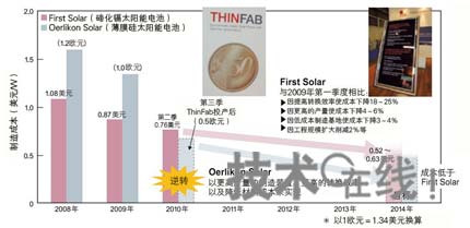 右圖是制造成本終于降至€0.5/W歐瑞康太陽能發(fā)布了可以€0.5/W的成本制造薄膜硅太陽能電池的生產(chǎn)線“ThinFab turnkey”。該公司今后打算將生產(chǎn)成本控制在低于First Solar的水平。(圖依First Solar和歐瑞康太陽能的資料所制)