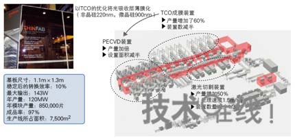 歐瑞康太陽能公司之所以能夠?qū)崿F(xiàn)€0.5/W,是因為采取了諸如光吸收層的薄型化、由制造裝置改良而提高產(chǎn)量和降低材料消耗量等多項措施的結(jié)果。將PECVD裝置、TCO和激光劃片裝置等的生產(chǎn)量均提高了50%以上,因而大幅削減了必要的裝置數(shù)量和設(shè)置面積(圖9)。