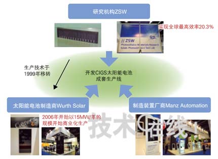 上圖將ZSW的技術(shù)應(yīng)用于成套設(shè)備轉(zhuǎn)換效率世界紀(jì)錄的保持者ZSW與太陽能電池制造商及制造裝置廠商聯(lián)手,開發(fā)CIGS太陽能電池的成套設(shè)備。