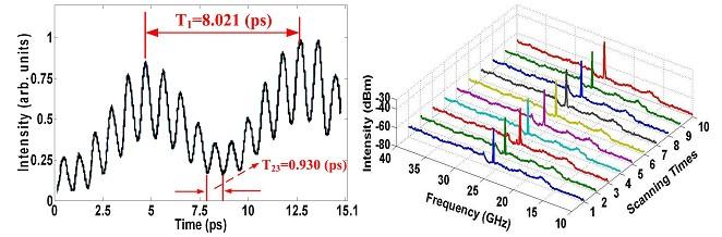 為 了克服以上困難,武漢光電國家實驗室(籌)光電子器件與集成研究團隊的孫軍強教授和趙亮博士經(jīng)過兩年的潛心研究,首次發(fā)現(xiàn)了高非線性光纖中的相位鉗位效 應(yīng),即利用強的自相位和交叉相位調(diào)制使得相位固定在某一個值,利用低效率的四波混頻效應(yīng)來抑制相位的抖動,使得從不同激光器激射的非相干光實現(xiàn)了相位同 步,進而得到了穩(wěn)定的微波信號。在理論上,我們導(dǎo)出了實現(xiàn)相位鎖定的條件,并且在實驗上驗證了這一結(jié)果。下圖顯示了穩(wěn)定的微波信號在自相關(guān)儀和電譜儀中的 測量結(jié)果。