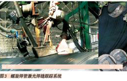 螺旋焊管主要用于油氣管道、水管以及樁管。與直縫焊管不同,螺旋焊管為連續(xù)生產(chǎn),這就意味著激光跟蹤系統(tǒng)能夠連續(xù)長(zhǎng)時(shí)間穩(wěn)定可靠的工作。圖3給出了 寶雞石油鋼管有限公司的螺旋焊管激光焊縫自動(dòng)跟蹤系統(tǒng)。迄今為止,國(guó)內(nèi)的寶雞鋼管廠、中原焊管、中石油管道局鋼管廠、金州管道、寶世威鋼管廠都應(yīng)用了類似 的激光焊縫跟蹤系統(tǒng)。