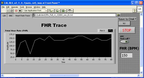 圖2b顯示了三個(gè)可選的顯示,包括數(shù)字同步或鎖相放大器(LIA)、自適應(yīng)噪聲消除器(ANC)、及心律軌跡。前兩個(gè)顯示可用于輔助開發(fā),第三個(gè)顯示用于表明胎心率相對(duì)時(shí)間的值。用戶可在線觀察數(shù)據(jù)或?qū)⑵浔4嬗糜谶M(jìn)一步分析。