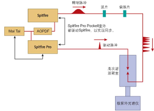 圖1:光譜物理公司的先進(jìn)同步裝置示意圖。兩個(gè)再生放大系統(tǒng)同步精度達(dá)到#p#分頁(yè)標(biāo)題#e#200fs。通過(guò)對(duì)種子振蕩器進(jìn)行相位調(diào)整,可以產(chǎn)生0~12.5ns的延遲,并且不需要光學(xué)延遲。