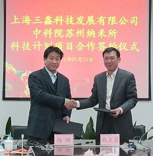 115日,在上海市科委的支持和雙方前期深入的溝通下,蘇州納米所與上海三鑫科技發(fā)展有限公司就共同開展“氮化鎵基藍(lán)光激光器工程化技術(shù)”項(xiàng)目正式簽約。楊輝所長代表蘇州納米所與三鑫公司副總經(jīng)理戴立勇簽訂了合作協(xié)議。