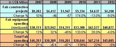 SEMI產(chǎn)業(yè)研究資深經(jīng)理曾瑞榆表示:今年晶圓廠總支出將可接近472億美元,不但高于2010386億美元的總支出。同時(shí)也超越2007年的晶圓廠總支出高峰464億美元的成績(jī)。下表一明列出了各年度的晶圓廠建置與設(shè)備支出數(shù)字。