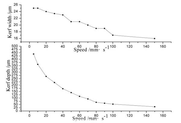 4 激光功率5w,重復(fù)頻率20kHz時(shí),切縫寬度及切割深度隨切割速度的變化