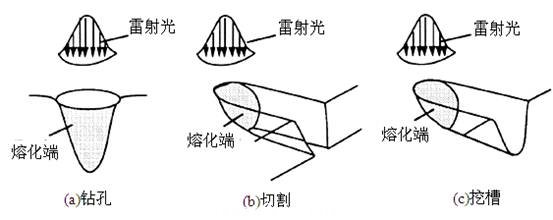 1. 雷射材料去除加工模式(a)鉆孔、(b)切割與(c)挖槽