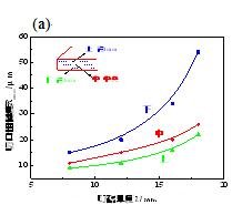 5. 雷射切割寬度、熱影響區(qū)與切割速度間的關(guān)系圖(a)雷射切割3mm厚鋼板時切割寬度與切割速度的關(guān)系與(b)雷射切割熱影響區(qū)與切割速度的關(guān)系圖