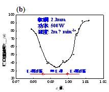 就金屬雷射切割的切口粗糙度之探討,一般以上段為佳,中段次之,下段最差。切口粗糙度與切割的切口有關(guān)。圖6(a)顯示切割厚度變化對切口粗糙度之影響。另外圖6(b)可知焦點位置對切口粗糙度的影響,當(dāng)工件至聚焦透鏡的距離與焦距的比值a0分布在0.988~1.003之范圍內(nèi)時,無毛邊之產(chǎn)生。例如,雷射切割2.3mm的低碳鋼板時,則采用負(fù)離焦0.30.7mm為佳。