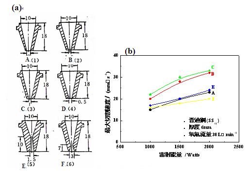 7. (a)噴嘴設(shè)計與(b)各個噴嘴設(shè)計所實驗之最大切割速度與雷射能量間的關(guān)系圖