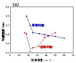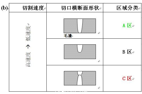 10. (a)輔助氧壓力與切割速度以及(b)切割速度增加對切口形狀的影響