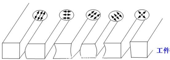 雷射切割中,切割速度會隨偏振光之取向而發(fā)生變化。由于受到雷射偏振之原因,切口底部容易產(chǎn)生偏斜之現(xiàn)象。由圖11觀察到偏振光的取向?qū)咨淝锌谛螤畹挠绊?,采用圓偏振光,切口平直,但對一般CO2雷射并不能直接輸出圓偏振光,因此在雷射切割時,為了獲得較好的切割質(zhì)量,常附加上45°反射的圓偏振鏡。圓偏振鏡通常會鍍上多層膜,以增加雷射光能量集中之程度。