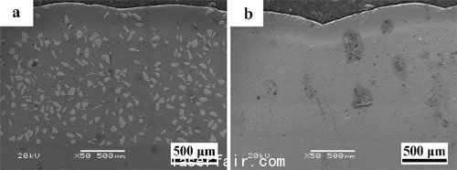 (a) NiCrBSi/WC-Ni復(fù)合涂層和(b) NiCrBSi涂層的截面形貌圖