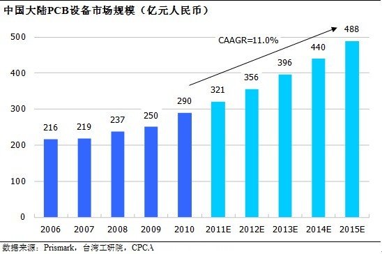 同步于PCB產(chǎn)值的增長(zhǎng),中國(guó)PCB設(shè)備將在2015年市場(chǎng)規(guī)模將達(dá)到488億元,2010年~2015年期間年均復(fù)合增長(zhǎng)率達(dá)到11.0%,顯著高于全球市場(chǎng)7.5%的增長(zhǎng)水平,顯示了中國(guó)PCB設(shè)備市場(chǎng)強(qiáng)健的增長(zhǎng)潛力。