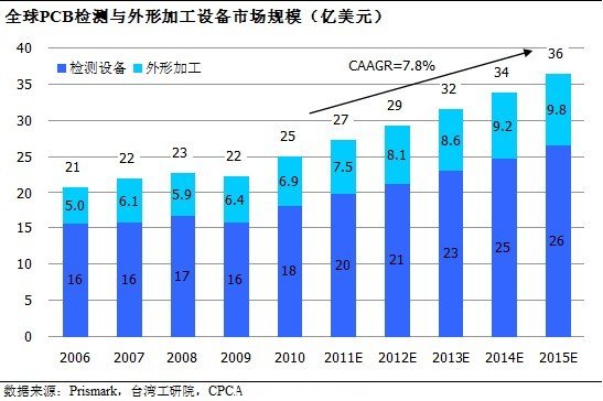 2010年,全球PCB檢測(cè)及外形加工設(shè)備規(guī)模達(dá)到25億美元,并將在2015年增長(zhǎng)到36億美元,年均復(fù)合增長(zhǎng)率為7.8%。