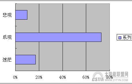 從圖中可以看出,調(diào)查結(jié)果為持“樂觀”態(tài)度的占到73%,感到“迷茫”的占17%,而感到“悲觀”的占10%。 #p#分頁標(biāo)題#e#