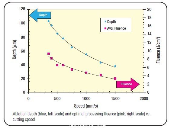 1. 融化深度(藍色、左側(cè)刻度)、能量密度(紅色、右側(cè)刻度)與切割速度的關(guān)系