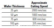 當今,商用激光器的功率級別不斷提高,這在納秒級窄脈寬355nm紫外激光器上也同樣如此,在這種趨勢下,關(guān)鍵問題在于如何將激光器功率與脈沖能量的提高盡可能充分而高效的利用到晶元刻劃工藝中。在光譜-物理工業(yè)激光應用試驗室,我們通過實驗驗證了線狀聚焦光斑在晶元分粒高效率方面的優(yōu)勢,證實了采用短脈沖、短波長的激光刻劃工藝不但可以得到最佳的切割質(zhì)量,還能達到較高的切割速度,如下表。