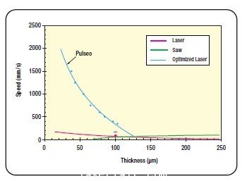 激光加工硅晶圓分粒方面有著眾多的文獻,研究了從長脈寬到短脈寬、激光波長與加工質(zhì)量與速度的關(guān)系。最近在薄硅晶圓采用納秒脈沖的355nm調(diào)Q激光器分粒與傳統(tǒng)的金剛石鋸片分粒在速度的比較方面也有文獻發(fā)表。對照這些文獻中提及的結(jié)果,光譜-物理Pulseo 355nm 20W激光器采用線狀優(yōu)化聚焦光斑技術(shù)得到的數(shù)據(jù)有著非常顯著的提高——使加工速度從100mm/s的量級提高到m/s的量級。