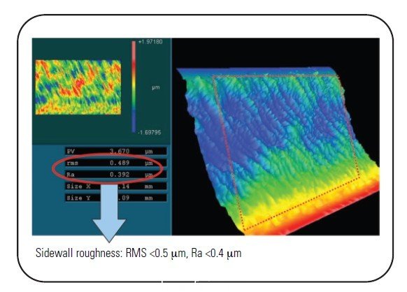 不僅實在切割速度方面,線聚焦光斑加工技術(shù)結(jié)合光譜-物理Pulseo激光器的短脈寬與短波長在加工過程中獲得的非常小的熱影響區(qū)域(HAZ),是獲得高質(zhì)量晶元分粒的至關(guān)重要的因素。扁長的線聚焦光斑作用在材料表面脈沖重疊率更高,切縫處受激光脈沖作用更加平均,切割效果非常整齊、平滑,切割側(cè)壁精度更高。線狀聚焦光斑的Pulseo 355 激光器在400mm/s的切割速度獲得的樣品,97μm的切割深度處光學輪廓儀測試表明側(cè)壁粗糙度可達RMS<0.5μm ,Ra<0.4μm。
