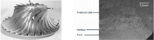 3 a)采用LENS制造的先進渦輪發(fā)動機的三合金葉輪;b) Ti6Al4V與γ-TiAl(Ti48Al2Cr2Nb)的連接界面