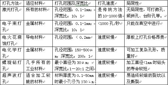 1 激光打孔方法與傳統(tǒng)打孔方法技術指標的對比