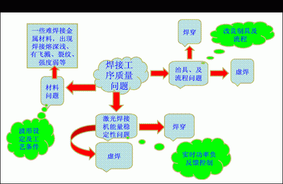 一般來說,在所焊接產(chǎn)品的同一部位連續(xù)出現(xiàn)焊接不良,很有可能是工作臺和夾具有問題,這時,需要從夾具和工作臺方面入手解決問題;如果來料批次不同,引起了焊接加工不良,可能是來料問題,需要檢查更換來料或改變激光焊接機波形設(shè)定工藝條件進(jìn)行解決;如果偶爾有焊穿和虛焊現(xiàn)象,可以檢查焊接機的能量穩(wěn)定性或工作臺及夾具是否存在問題。圖5是對激光焊接過程中有可能出現(xiàn)的問題的一個大概分析流程。