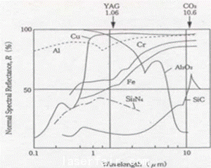 首先在確定加工材料、尤其是兩種以上不同的材料進(jìn)行焊接加工時,要參考相關(guān)文獻(xiàn),確定材料能否被可靠的焊接(表一列出了不同材料的YAG激光焊接特性,可作為參考),另外,不同材料對不同激光波長的反射率也不相同(參見圖1),反射率越高,激光焊接越困難。