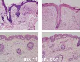 圖3:在治療前(左側(cè))及結(jié)束治療后6月(右側(cè))取活檢標(biāo)本制作組織學(xué)切片,受試者一側(cè)面部接受單次點(diǎn)陣式剝脫CO2激光治療(上排),另一側(cè)面部接受5次點(diǎn)陣式非剝脫激光治療(下排)。顯微學(xué)下分析表明CO2激光治療后新膠原有30%的增加,非剝脫激光治療后新膠原增加僅為15%。切片由病理學(xué)家Justin H. Ekuan, M.D.及AlirezaTafazzoli, M.D.來評價,照相由James A. Heinrich, M.D負(fù)責(zé)。