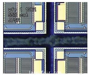 自1996年以來,JPSA一直采用266nm的DPSS激光器對藍(lán)光LED藍(lán)寶石晶圓的氮化鎵正面進行劃片,正切劃片速度可達(dá)150 mm/s,這樣每小時可加工大約15片晶圓(標(biāo)準(zhǔn)的2英寸直徑晶圓,芯片尺寸350× 350微米)。這種方式的產(chǎn)量高,對LED性能的影響小,允許晶圓翹曲,比傳統(tǒng)機械方式的劃片速度要快得多。