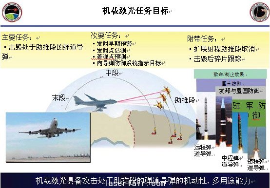 機載激光器是彈道導彈防御系統(tǒng)的空基部分,主要用來尋找、跟蹤和擊毀處于助推段的彈道導彈。該系統(tǒng)是一架經(jīng)過大幅改造的波音747-400F飛機。顯而易見,作為導彈防御系統(tǒng)的一部分,這便于部署和機動,可用來保護美國、已部署的軍隊,使美國的盟國、友邦和其他利益相關(guān)地區(qū)免受彈道導彈的攻擊。這是一個定向能武器項目,(我們)目前在該領(lǐng)域具有領(lǐng)先優(yōu)勢。