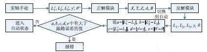 為了解決反解多解問題,在反解模塊中引入變量來讀取實軸實時坐標(),將其與反解計算值() 進行比較,取最接近實軸實時坐標的那組解作為輸出,經(jīng)過處理后驅(qū)動實軸運動.為了節(jié)省運算時間,此判斷過程只在實軸單軸手動切換到自動狀態(tài)時生效,判斷過后一直采用選中的那組解的解析表達式計算實軸坐標,直到下次切換.