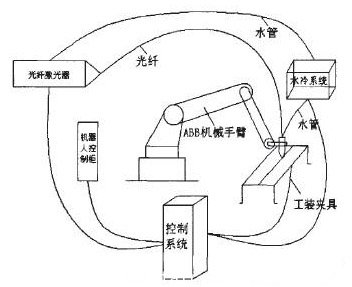 機器人光纖激光加工系統(tǒng)組成如圖2所示,主要是由光纖激光器、機器人(本體和控制柜)、水冷系統(tǒng)、光束傳輸系統(tǒng)、激光頭和工件裝夾系統(tǒng)組成。