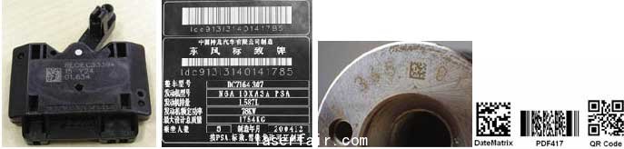 早期的汽車零部件標(biāo)記主要靠在產(chǎn)品上標(biāo)記序列號(hào)來滿足可追溯性要求,條碼誕生被迅速應(yīng)用到汽車零部件的標(biāo)識(shí)中(如圖二),不過其信息量少,容錯(cuò)性差使其并沒有得到全面的普及。這個(gè)問題直到二維碼技術(shù)的誕生才得到解決。