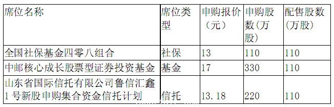 光韻達網(wǎng)下共發(fā)行330萬股,機構申購上限為330萬股。經(jīng)過搖號,每個中簽號可以獲得110萬股。從配售結果來看,申購席位較多的基金并未獲得高于其他中簽機構的配售股數(shù),共有3家機構席位中簽,且分布在社保、基金和信托三家不同類型的機構。其中中郵創(chuàng)業(yè)基金管理有限公司和山東省國際信托有限公司較為看好該股,申購報價略高于平均水平。