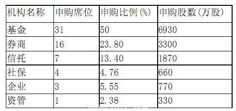 本次網(wǎng)上申購共有151967戶參與,申購量達到155127.90萬股,中簽率為0.883142%。本次共有62家機構席位參與網(wǎng)下申購,申購量為13860萬股。其中基金和券商機構申購量位居前列,席位數(shù)均排在參與機構前兩位。