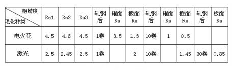 (Ra1 Ra2 Ra3為軋輥前端、中部、后端圓周方向各取六點粗糙度的平均值;軋制鋼板的厚度均為1mm;以上數(shù)據(jù)來源于武鋼一冷軋)