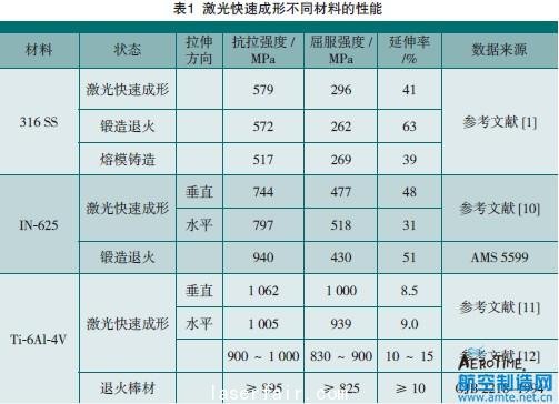 美國首先于1995年提出高性能金屬零件的激光快速成形技術(shù),在能源部研究計劃支持下,Sandia及Los Alomos國家實驗室率先發(fā)展出稱為LENS(Laser Engineered Net Shaping)[4]及DLF(Directed Light Fabrication)[5]的技術(shù),研究了不銹鋼、鎳基合金、鈦合金、難熔金屬等材料的組織及性能,并采用該技術(shù)成功制造出錸及銥的噴管[6],顯示出該技術(shù)在高性能金屬零件直接成形方面的優(yōu)勢,并于1998年由Optomec公司成功推出商業(yè)化的LENS系統(tǒng)。隨后美國的Stanford University、University of Michigan、英國的University of Birmingham、University of Manchester、University of Liverpool及加拿大的National Research Council等也發(fā)展了分別稱作為SDM(Shape Deposition Manufacturing)、DMD(Direct Metal Deposition)、DLF(Direct Laser Fabrication)、DLD(Direct Laser Deposition)、LDC(Laser Direct Casting)、LC(Laser Consolidation)的技術(shù)[7-11],盡管各自的名稱不同,但原理和方法是一致的,系統(tǒng)所配備的激光器主要有CO2氣體激光器、Nd:YAG固體激光器及光纖激光器,所成形的材料包括各種不銹鋼、鎳基合金、鈦合金等。相關(guān)研究表明,激光快速成形的金屬零件具有致密、細(xì)小的組織,成分均勻,力學(xué)性能達(dá)到或超過鍛件水平[10-12],表1為激光快速成形不同材料的力學(xué)性能。