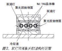 進一步的發(fā)展是把兩個并排的單燈單棒聚光腔做成一體,形成雙燈雙棒雙腔聚光腔。每個腔體由兩個相同的單橢圓聚光腔并排組成,每個單橢圓聚光腔中各放置一支晶體棒和一支泵浦燈,其結(jié)構(gòu)示意如圖2。