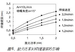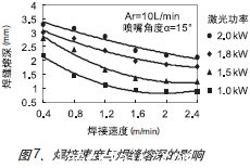 如圖7所示,根據(jù)激光功率的不同,分別在1.0、1.5、1.8、2.0KW四種不同激光功率下研究焊接速度對焊縫熔深的影響。