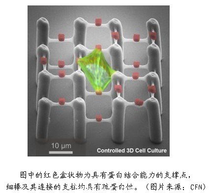 在這項研究中,研究人員采用了一種具有疏蛋白(protein-repellent)性的柔性聚合物,并以一種可結合蛋白材料作為聚合物的盒狀支撐點,通過激光直刻法(Direct Laser Writing Method)制作出一種特殊的聚合物支架。這種支架的疏蛋白結構由25微米高的支柱組成,各個支柱之間通過細棒連接,連接點高度不一,然后盒狀支撐點被精確地放在細棒中間。當含有粘附蛋白的溶液浸入支架時,蛋白只會與盒狀支撐點相結合,兩小時內,個體細胞占滿支架,且只粘附在特定位點。由此,通過改變支撐點和細棒的位置,可實現對細胞形狀的三維控制。