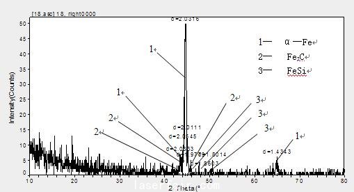 圖3為3號試樣的XRD衍射圖譜。由衍射結(jié)果可以看出,焊接接頭相組成除了基體相α—Fe外,還有Fe3C、FeSi等相。由于α—Fe的硬度較低,而Fe3C和FeSi的硬度比較高,這些相的存在,可以保證焊接區(qū)有良好的強韌性配合。