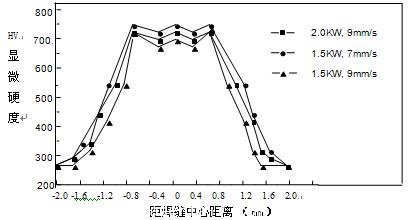 三種焊接工藝的焊縫接頭的硬度分布曲線從圖4可以看出其硬度分布曲線的走向成三個明顯的區(qū)域:一是中間突起的平臺區(qū)域,這是焊縫區(qū)域,平均硬度為 HV710,其硬度值要明顯高于其他區(qū)域;二是從平臺區(qū)域往兩邊各有一個斜率較大的坡度,說明硬度值在這個區(qū)域有一個明顯的銳減,這部分是焊接熱影響區(qū),從上面的組織分析可以看出這部分還是有馬氏體和貝氏體存在.所以硬度值還是比較高的;第三區(qū)又是一個硬度平臺,這是基材組織,平均硬度為HV230左右。