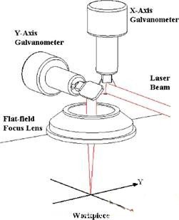 點(diǎn)陣式在線激光打碼技術(shù)采用振鏡式掃描策略。如圖1所示,打碼系統(tǒng)通過X、Y兩個振鏡的角度偏轉(zhuǎn)來控制激光的掃描路徑。